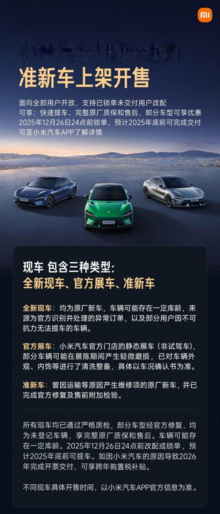 小米汽车在12月12日11点更新了销售渠道,通过“现车选购”功能引入了准新车资源。这一调整面向所有消费者开放,同时允许已经锁单但尚未交付的用户更改配置。部分车型提供了价格调整策略通,如果在12月26日24点前完成锁单,预计在2025年年底之前能够实现交付。